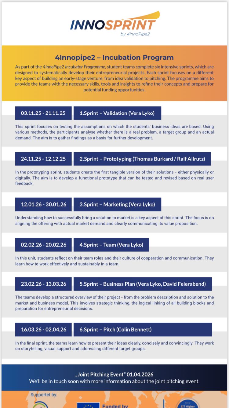 Обрані стартапи отримають інтенсивне поєднання коучингу, наставництва та практичних семінарів від провідних експертів з усієї Європи. Учасники пройдуть шість інтенсивних спринтів з листопада 2025 року по квітень 2026 року, систематично розвиваючи свої проєкти від ідеї до інвестиційної готовності.